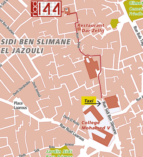 Ausschnitt Altstadt (Medina) Marrakesch - Kennzeichnung des Fußweges vom Taxistand zum Hotel