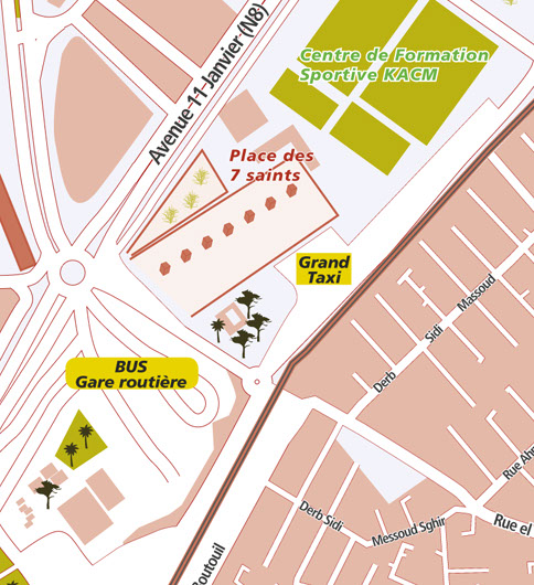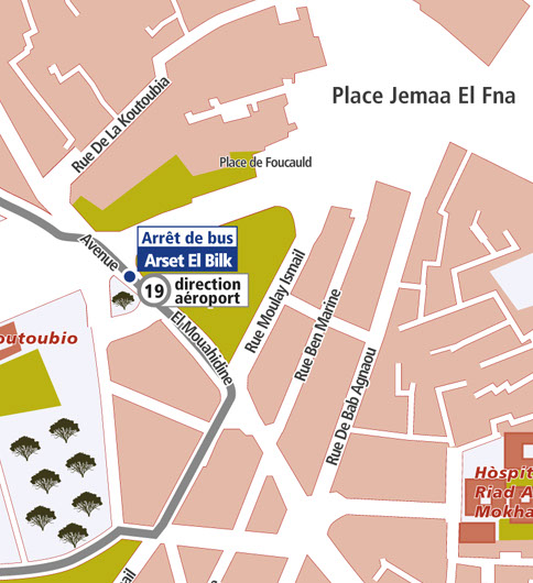 Ausschnitt Altstadt (Medina) Marrakesch - Kennzeichnung von Taxistand, Sehenswürdigkeiten, und Busbahnhof
