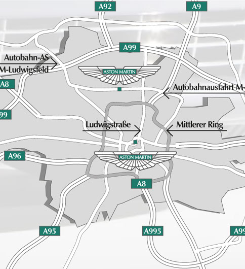Für die Geschäftsstandorte des Händlers für Aston Martin in München sollen Anfahrtspläne mit Kennzeichnung der Geschäftsstandorte erstellt werden.